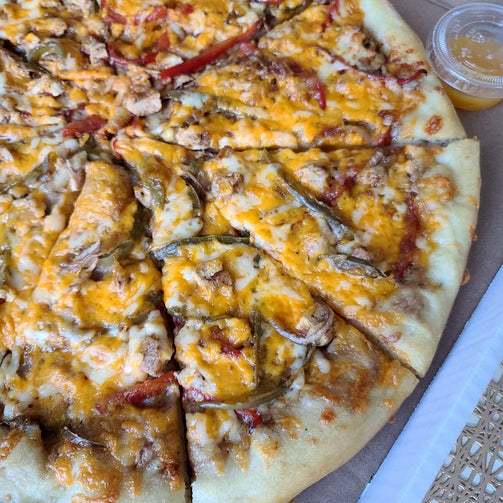 "Indulge in a fiery and flavorful pizza experience with our homemade spicy cream sauce jerk chicken pizza! Featuring a base of our creamy and spicy homemade sauce, this pizza is then topped with grilled jerk chicken, assorted peppers, and onions, all smothered in a blend of cheddar and mozzarella cheese that will have you drooling. Served with a side of ranch and scotch bonnet pepper sauce, this pizza is the perfect blend of creamy, spicy, and tangy flavors that will tantalize your taste buds. Size XL large 16"