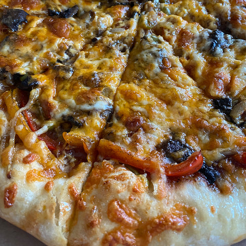 Looking for a flavorful and satisfying vegetarian option? Look no further than our veggie jerk pizza! Featuring our homemade spicy jerk BBQ sauce, this pizza is topped with a delicious mix of jerk-marinated veggies, including mushrooms, onions, and red, green, and yellow peppers. To add even more flavor and texture, we top the pizza with a blend of cheddar and mozzarella cheese that melts to perfection in the oven.